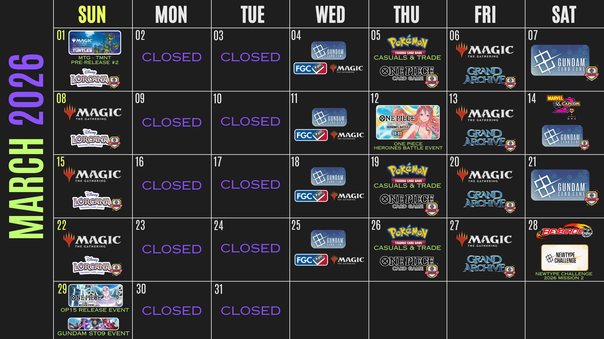 Magic: The Gathering | Free-Play Fighting Game Arcade | D&D | Trade Pokemon Cards | Fightstick Repair | One Piece TCG League | Buy Retro Video Games | Play Grand Archive | Eat Some Snacks | Gundam TCG League | Fighting Game Tourneys | Hang Out and Draw | Lorcana League | …And MORE!
